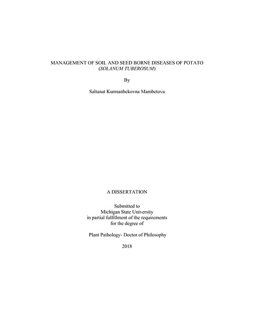 There are numerous important potato diseases that are annual production concerns for growers in Michigan. This study included three projects. The first project evaluated commercial cultivars and advanced breeding lines (ABL) with foliar resistance to late blight via tuber tests, and integrated disease management with foliar resistant varieties/ABLs in combination with fungicide seed treatments against four of genotypes of P. infestans. Commercial cultivars and ABLs showed differential responses to genotypes of P. infestans based on both experiments. Overall, ABLs and commercial cultivars in combination with seed treatments performed better based on plant stand compared to inoculated non-treated controls. A second project evaluated conventional and quantitative PCR primers for detection of Pectobacterium and Dickeya spp. to monitor the presence and spread of these bacteria in the field and in seed-lots for certification. In two consecutive years samples from the field had both Dickeya and Pectobacterium spp. Whereas, tubers from seed-lots from Michigan seed production did not test positive for Dickeya spp. and overall relatively low levels of Pectobacterium spp. within acceptable tolerance. Three conventional PCR primers were reliable and were able to differentiate Pectobacterium down to species. Finally, a third project characterized Streptomyces spp. recovered from potato and turnip phenotypically based on virulence, pathogenicity, and morphologically, and determined the diversity and phylogenetic relationships among species. This study identified morphological, molecular and phylogenetically differences among Streptomyces spp. isolated from turnip and potato.