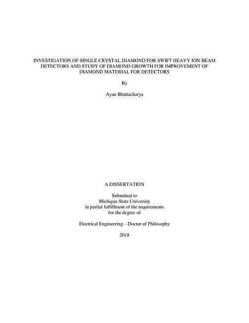 Diamond is a material with outstanding mechanical, electrical and optical properties. Single crystal diamond has a large bandgap (~ 5.47 eV), large atomic displacement energy (~ 43eV), high electric breakdown field (107 V cm-1) and high thermal conductivity at room temperature. All these superior properties make diamond inherently a superb radiation tolerant material for harsh radiation environments. In this study, single crystal diamond (scd) substrates grown at Michigan State University (MSU) by microwave plasma-assisted chemical vapor deposition (MPACVD) are tested to develop detectors for swift heavy ion beam. Prior to beam irradiation, the material properties of the diamond were characterized by UV-VIS spectroscopy and FTIR (Fourier Transform Infrared Spectroscopy). After fabrication of detectors, their performance were tested by irradiating with swift heavy ion (SHI) beams in the range of 100-150 MeV/u at the National Superconducting Cyclotron Laboratory (NSCL) at MSU. In addition to MSU grown samples, commercial electronic grade samples (Microwave Enterprises Ltd.) were also investigated under the same radiation environment. Post irradiation, samples ware characterized by the transient current technique (TCT) to understand how charge transport properties get affected by the beam irradiation. The charge collection efficiency (CCE) and the lifetime of the holes and electrons created were studied. A completely non-irradiated commercially available electronic grade diamond was also tested in the same testing configuration to generate a reference. Beam irradiated samples were also characterized by X-ray diffraction and Raman spectroscopy to characterize for any structural damage. The overall characterizations mostly confirmed a deterioration of charge transport properties. However, any evidence of substantial structural damage by the irradiation could not be found. One relevant observation was that the MSU lab grown diamond had a shorter carrier lifetime primarily due to more nitrogen impurities present in the grown diamond. Next, to improve charge transport performance of MSU lab grown diamond substrates for electronic applications, single crystal diamond was deposited in a low nitrogen environment to grow thick layers (≥ 200 μm). In general, epitaxial growth on surface close to the (001) crystallographic plane at a low nitrogen environment often suffers from defects forming on the surface. Such defects arise from dislocations (already present in the substrate), twining during the growth process. A possible solution to this issue is to grow samples on misoriented substrates (i.e. on surfaces that are slightly tilted from the (001) plane). The resulting surface profile largely depends on the growth condition (i.e. temperature, pressure, methane concentration), as well as the substrate misorientation angle. The deposition on a misoriented surface happens with a step flow growth process. It is found in research literature that impurities present in the deposition gas generally tend to concentrate at steps more than on terrace. Hence the spatial size of the step height and terrace width distribution produced as a result of misorientation angle variation is important for the quality of the deposited diamond. A detailed study of the distribution of step height and terrace width with respect to misorientation angle for thick layers (~ 200 μm) was performed. The step height and terrace width distributions can help decide the selection of offcut angle, doping concentration and growth layer thickness, which otherwise may create localized and non-uniform distribution of impurities and non-uniform breakdown electric fields.