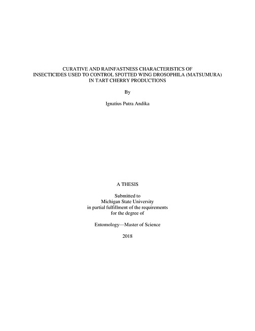 Spotted wing drosophila (Drosophila suzukii Matsumura) (SWD) is an invasive pest originated from East Asia, which has caused devastating damaged to soft-skinned fruit productions globally and an increase of growers’ reliance on insecticide to meet market standards. However, the intensive use of insecticides raises community concerns regarding environmental health, human health, and the risk of SWD population to grow resistances. Therefore, exploring other activity modes of insecticides registered against SWD besides adulticide action may provide information to refine existing insecticide programs. The data from these experiments provide insight of the curative and rainfastness of insecticides registered against SWD in tart cherry productions. The residue data in these experiments compliment the biological data and provide better understanding on how these insecticides work against SWD.