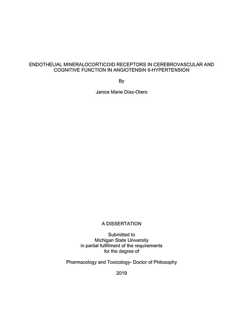 Vascular cognitive impairment and dementia (VCID) is a growing public health issue that lacks effective treatments. VCID is described as a spectrum of cognitive deficits that have a cerebrovascular origin, meaning there is an impairment in the structure and function of small arteries and arterioles, including parenchymal arterioles (PAs) and capillaries. My studies focused on the PAs that are critical regulators of blood flow to the cerebral microcirculation. These are considered the weak link or a bottle-neck in the perfusion of the cerebral microcirculation. Importantly, occlusion of a single PA produces a microinfarct and cognitive dysfunction. Hypertension, a primary risk factor for VCID, causes artery remodeling and impaired endothelial function, which leads to impaired autoregulation of cerebral blood flow. The mechanisms by which artery remodeling and impaired autoregulation occur with hypertension remain unknown. Elevated aldosterone levels and mineralocorticoid receptor (MR) activation have been linked to vascular damage in hypertension. In rat models of hypertension, MR antagonism prevents hypertensive artery remodeling, but the signaling mechanisms and the specific cell types involved in the process have not been identified because MR antagonists inhibit the actions of aldosterone in all cell types in the arteries. Endothelial MR signaling in peripheral arteries plays a critical role in endothelial dysfunction. The endothelial MRs regulate vasodilation in peripheral arteries through calcium-activated potassium (KCa) channels, in particular, small conductance (SK Ca) and intermediate conductance (IKCa) channels. These channels can be activated by calcium influx through transient receptor potential (TRP) channels, such as the V4, and we recently showed that TRPV4 channels mediated PA endothelium-dependent dilation. The studies in the peripheral vasculature suggest that the effects of MR activation are vascular bed-specific and that we need to study different vascular beds separately. My studies tested the hypothesis that in hypertension endothelial MR activation will result in PA inward remodeling, impaired TRPV4-mediated dilation, and reduced cerebral blood flow. Furthermore, I proposed that the cerebrovascular dysfunction caused by endothelial MR activation would result in cognitive impairment. I addressed these hypotheses using a pharmacological and genetic approach. My studies show that MR signaling at the level of the endothelium mediates PA inward hypotrophic remodeling and impaired endothelium-dependent dilation. I also show that MR signaling mediates cognitive dysfunction in hypertension, but this was not specific to endothelial MR signaling. My studies also show that TRPV4 channels are important regulators of cognitive function. My studies could have wide reaching implications because identification of the cell specific actions of MR signaling could allow us to better define the downstream mechanisms of MR-mediated changes in hypertension. This could contribute to the development of better therapeutic approaches to improve cerebrovascular health in hypertensive patients, a rapidly growing concern in our aging population.