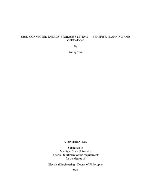 "Deployment of energy storage systems (ESSs) is gaining significant momentum due to economic incentives, power system regulation requirements, and integration of renewable energy resources. This dissertation covers three aspects of grid-connected ESSs: benefits, planning, and operation. First, the benefits and use cases of ESSs are reviewed and a comprehensive evaluation method for estimating stacked revenue of ESSs is proposed. The stacked revenue from an ESS cannot be calculated by merely aggregating the benefits from various applications (e.g., energy arbitrage, frequency regulation, and outage mitigation) as the ESS may not be available for all types of applications during the same time interval. A model incorporating component reliability, power system operation constraints, and storage system operation constraints is developed to evaluate the composite revenue generated from the applications. Second, for planning purposes, a model to estimate the capacity value of ESSs is developed and a sensitivity guided approach to ESS siting is proposed. In contrast to conventional generators with the capability to provide energy upon demand, ESSs are energy-limited resources. In addition, it is possible that the availability of an ESS is low when it is needed to provide its capacity to maintain system reliability due to low state of charge. Thus, the work presented here proposes a method to evaluate the actual capacity contribution of ESSs, considering the energy-limited characteristic and the availability uncertainty. Also, it is necessary to determine suitable locations so as to maximize the benefit of ESSs. This dissertation proposes a sensitivity guided approach which aims at finding the optimal location of ESSs to reduce the peak hour generation cost. The last part of this dissertation proposes a model to determine the operation strategy of battery ESSs. This algorithm not only attempts to maximize the financial benefits but also considers the cycling behavior and its impact on the longevity of battery energy storage systems."--Page ii.