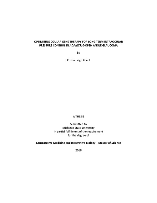 Glaucoma is an optic neuropathy that causes irreversible damage to retinal ganglion cell axons. Most forms of open angle glaucoma (OAG) are associated with an increased intraocular pressure (IOP) due to obstruction of the aqueous humor outflow pathways (AHOP). For years our team has worked to preserve vision by targeting these outflow pathways by delivering a novel capsid mutated adeno-associated virus (AAV) mediated gene replacement therapy in a clinically relevant and well-established OAG dog model caused by a mutation in ADAMTS10. Past studies with ssAAV2-(Y444F)- hGFP (targeting) and ssAAV2-(Y444F)- hADAMTS10 (therapy) at vector genome (vg) dose of 1-3x10 11 vg administered intracamerally (IC) in a 50æL volume delivered safe and long-term transgene expression to the AHOPs; however, an IOP reducing therapeutic effect was not achieved. Our goal was to increase transduction efficiency to the AHOPs by delivering the same vector constructs at a higher dose. In Aim 1, we showed in 5 dogs that 2.78-5.56x1012vg provided increased and clinically observable transgene expression within the iridocorneal angle (ICA). In Aim 2, 2 of 3 dogs IC injected with ssAAV2-( Y444F)-hADAMTS10 at 1.25-1.43x1012vg experienced a significant reduction in IOP by 19-20 days post-injection with a steady and well-maintained reduction for at least 105 weeks. ssAAV2-( Y444F)-hADAMTS10 was well-tolerated and resulted in an increased outflow facility by 3-75%. These studies provide proof-of-concept that modification of gene expression within the AHOP is possible and can result in long-term IOP control.