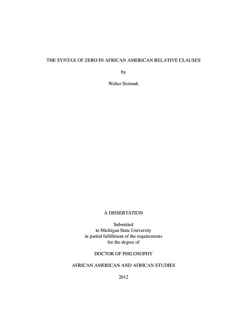 "The following study presents a syntactic analysis of African American relative clause constructions. Relative clauses in African American English (henceforth African American) are distinct from those used in Standard English. The purpose of this study is to give a description of the observed patterns and to discover the principles at work, thus explaining why the patterns in African American are distinct from those that occur in Standard English. This project investigates the occurrence of zero relative pronouns in subject relatives and appositive relatives in African American relative clause constructions."--P. 1.