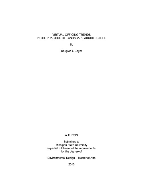 This research examines trends in virtual officing in project-based organizations such as landscape architecture firms. Virtual officing is the process of employees conducting business full-time in designated places other than a central office. Of particular interest is the development of communications technology to allow these new business models to grow and prosper. A survey was distributed by the American Society of Landscape Architects to landscape architecture member firms, with questions focusing on their business practices and virtual officing trends. It was found that virtual officing usage is on the rise in landscape architecture firms. Trends in hiring also were positively affected by the presence of virtual officing, showing a correlation between this new business model and the overall strength of a firm. -- Abstract.