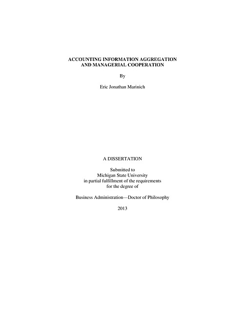 When managers face incentives against cooperation, accounting information can increase managerial cooperation when it allows managers to perfectly verify the cooperativeness of others' prior actions. The extent to which accounting information facilitates perfect verification of others' prior actions, however, can depend on its aggregation. This dissertation provides theory-consistent experimental evidence of the effects of accounting information aggregation on managerial cooperation when managers face incentives against cooperation. Based on the psychology theory of non-consequential reasoning, I predict and find that managerial cooperation is higher when accounting information is aggregated and individuals cannot perfectly verify others' prior actions than when accounting information is disaggregated and individuals can perfectly verify others' prior actions. The experimental results indicate that individuals are more likely to use non-consequential reasoning when accounting information is aggregated than when it is disaggregated. As a result, they are more likely to frame decisions as group decisions and cooperate because it is the only action that leads to the best group outcome.