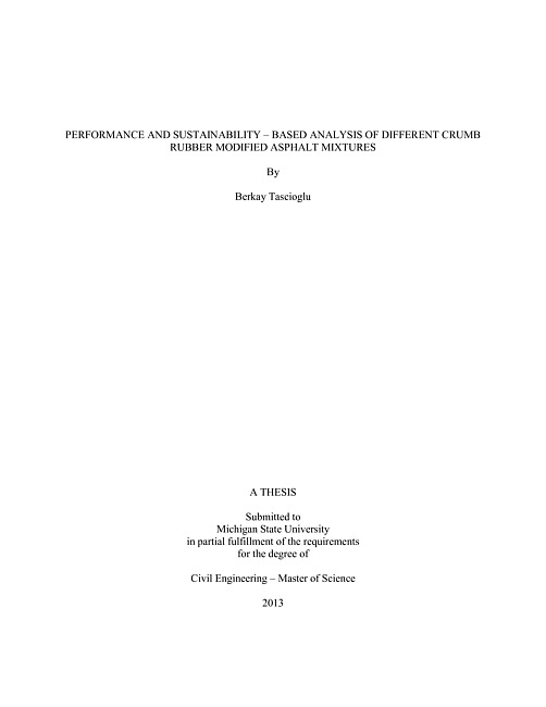 Disposal of scrap tires in stockpiles is one of the most significant environmental problems in the U.S. In order to reduce the negative effects of the scrap tires, tire management programs have been developed by different states. One method of beneficially re-using the scrap tires is the construction of crumb rubber (CR) modified asphalt pavements. Today, many states, local agencies and municipalities are using crumb rubber modified asphalt mixtures in pavement construction. There are currently three major methods of introducing CR in asphalt mixtures, namely; wet process (CRWet), dry process (CRDry), and the terminal blend process (CRTB). Most past research focused on each of these technologies individually and compared with traditional or polymer modified asphalt mixtures. There is a need to comparatively evaluate the performances of these technologies and unmodified (traditional) asphalt mixtures. In order to address this issue, a comprehensive study of three different CR types (CRWet, CRDry and CRTB) was conducted in this research. The scope of this study included both asphalt binder tests (Brookfield viscosity, resilience, needle penetration and softening point tests) and asphalt mixture tests (Dynamic modulus (|E*|) test, flow number (FN) test, four point bending beam (FPBB) test and tensile strength ratio (TSR)). Samples were compared in terms of their rutting, fatigue cracking and moisture susceptibility performances. The scope of this research also included sustainability-based analysis of CR modified HMA pavements. Four sustainability rating tools (LEED, Greenroads, GreenLITES and INVEST) were studied and compared to each other in terms of their applicability to CR modified HMA's.