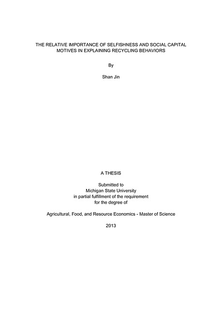 "Based on previous studies on social capital, this thesis aims to further understand social capital motives and their application in recycling behaviors in a university community."--From abstract.