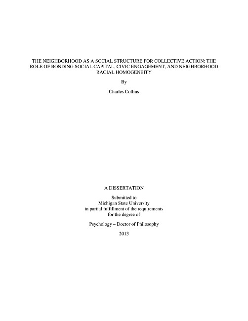 The neighborhood as a social structure for collective action : the role of bonding social capital, civic engagement, and neighborhood racial homogeneity