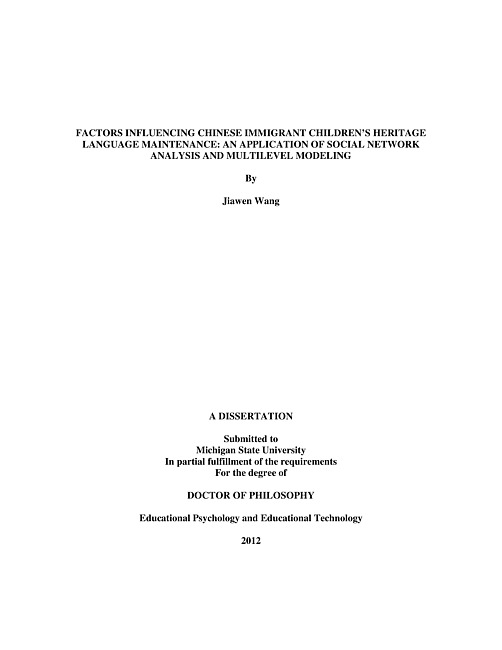 Factors influencing Chinese immigrant children's heritage language maintenance : an application of social network analysis and multilevel modeling