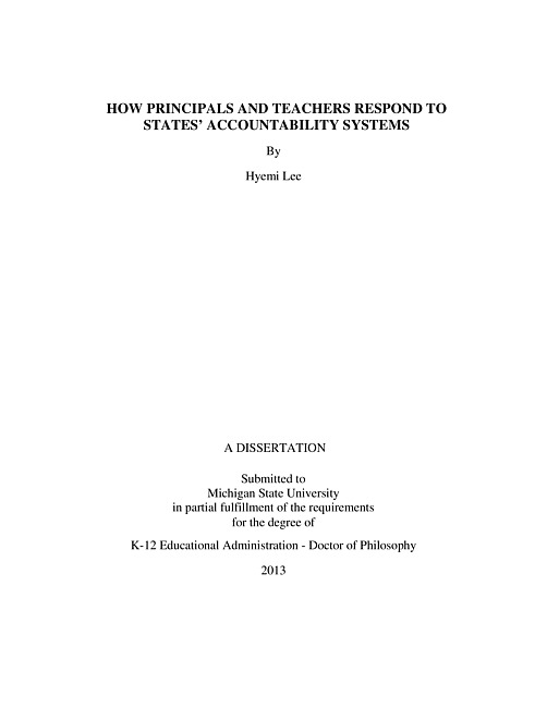 Since the 1990s, many states have started implementing standards-based reforms and developed their own accountability systems. Each state established academic content and performance standards, implemented test for all the students in grades 3 through 8 annually, and set up annual measurable objectives in reading and mathematics for districts, schools, and designated student subgroups within schools. The combination of states' accountability policies, such as performance standards, high school graduation exit exams, and the difference of between starting points and intermediate goals, may lead to the varying strength of the accountability systems in different states. Although several studies focused on whether these differences are related to students' achievement and teachers' instruction, little is known about how principals respond to accountability systems, although principals make a big difference in teachers' instruction and students' academic outcomes. Therefore, it may be necessary to find the relationship between the strength of the states' accountability policies and principals' responses and the relationship between the strength of the states' accountability systems and teachers' responses. The relationship between the strength of accountability systems (the stats' proficiency performance standards, the difference of starting point and intermediate goals (AMO strength) in states, and the high school graduation exit exams) and principals' responses (having influence on instruction and facilitating teachers' learning) were studied using 2-level hierarchical linear modeling (HLM) analysis based on 2007-2008 SASS, and the relationship between the strength of accountability systems and teachers' responses (teacher autonomy and their participation in professional development programs) were examined using 3-level hierarchical linear modeling analysis based on the same data set.The analysis of two level HLM found the negative effects of states' accountability systems on principals responses. AMO strength was negatively related to principals' influence on instruction, and the high school graduation exit exams negatively affected principals' support of professional days before and during the school year. However, other states' accountability policies, the proficiency performance standards may not have any relationship with principals' influence on instruction and their facilitating teacher learning. Principals' professional development programs and school climate were related to principals' responses to states' accountability systems. The findings of three level HLM showed that the proficiency performance standards increase teacher curriculum autonomy and their spending time for content professional development programs although AMOs strength and high school graduation school exit exams decreased them. Principals were an essential factor for teacher autonomy and their participation in professional development. School physical features were effective on teacher curriculum autonomy and their content professional development programs, while school climate were critical on teacher instructional autonomy and teachers' spending time in classroom management.
