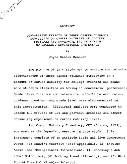 Comparative effects of three career guidance strategies on career maturity of college freshman and sophomore students with no declared educational preference