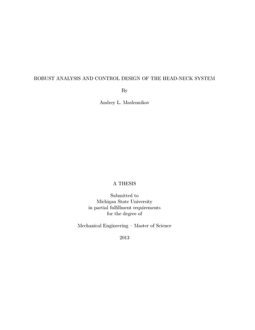 Neck pain is the one of the most frequently reported musculoskeletal complaints. A systematic evaluation of a neck condition may allow clinicians to diagnose possible problems that a subject might have in an objective manner. In this dissertation, we propose a systematic methodology for measuring robustness of the head-neck system that can be used as an objective measure of the head-neck system characteristics. Our method builds on computing the structured singular value μ as a measure of robustness for a particular subject. The μ value is computed under the consideration that the variability of head-neck system model parameters for a tested subject comes from the estimation errors as well as from the natural variation of biological parameters. Both sources of subject's variability determine uncertainty levels that are within some physiologically reasonable ranges. In addition, we analyzed worst-case scenarios of the head-neck system model. The worst-case analysis can provide us with a possible tool to predict what would be the combination of parameters that may cause the worst-case performance. Finally, the design of the robust controller for the head-neck system is also discussed in this dissertation.