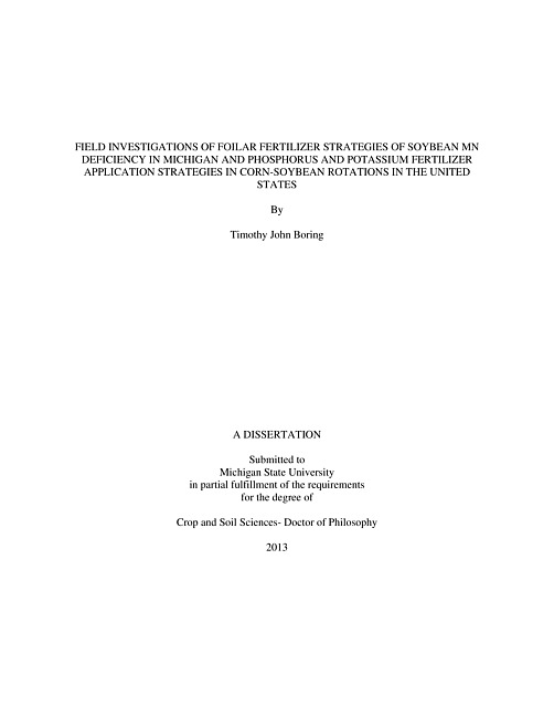 Field investigations of foliar fertilizer strategies of soybean Mn deficiency in Michigan and phosphorus and potassium fertilizer application strategies in corn-soybean rotations in the United States