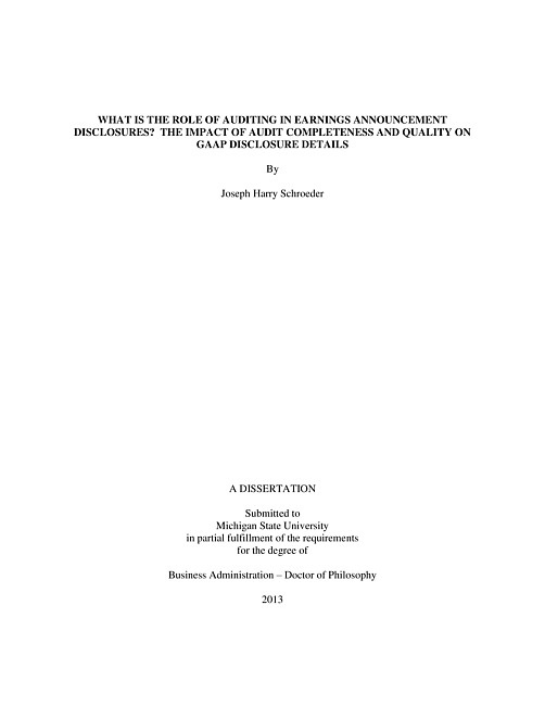 This study examines the role of the external auditor in management's decision about the amount of GAAP financial statement information to disclose in the annual earnings announcement. The earnings announcement is a key disclosure provided by public companies, and the value relevance of the earnings announcement is increasing in the amount of GAAP financial statement information included in the release. Despite the importance of earnings announcements as an information source for investors, there is no requirement that earnings announcements contain audited earnings numbers; in fact, recent trends show that the majority of companies release earnings before the completion of year-end audit fieldwork. I predict that companies that wait until the audit is complete (or closer to completion) prior to the release of their earnings announcement and companies with higher quality audits will provide more detailed GAAP disclosures in their earnings announcements because management has more confidence in the financial reporting system and the underlying financial statement balances. In addition, management benefits from a reduced risk of litigation and reputation loss. Consistent with my predictions, I find that when the audit is closer to completion at the earnings announcement release date and is of higher quality, the earnings announcement disclosure contains more overall GAAP disclosures, driven primarily by more detailed balance sheet and cash flow statement disclosures. The results of this study contribute to the academic literature by providing evidence that auditing facilitates more detailed earnings announcement GAAP disclosures. Furthermore, this study makes a key contribution to a new stream of literature that examines the impact of audit completeness on management disclosure decisions. These results are also important to regulators because they suggest that the external audit function plays an important role in key financial statement disclosure decisions beyond the mandatory audited financial statements included in the 10-K filing.