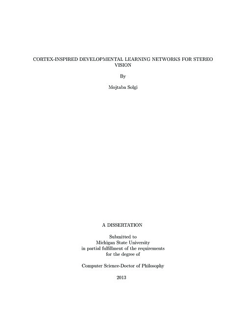 How does the human brain make sense of the 3D world while its visual input, the retinal images, are only two-dimensional? There are multiple depth-cues exploited by the brain to create a 3D model of the world. Despite the importance of this subject both for scientists and engineers, the underlying computational mechanisms of the stereo vision in the human brain is still largely unknown. This thesis is an attempt towards creating a developmental model of the stereo vision in the visual cortex. By developmental we mean that the features of each neuron are developed, instead of hand-crafted, so that the limited resource is optimally used. This approach helps us learn more about the biological stereo vision, and also yields results superior to those of traditional computer vision approaches, e.g., under weak textures. Developmental networks, such as Where-What Networks (WWN), have been shown promising for simultaneous attention and recognition, while handling variations in scale, location and type as well as inter-class variations. Moreover, in a simpler prior setting, they have shown sub-pixel accuracy in disparity detection in challenging natural images. However, the previous work for stereo vision was limited to 20 pixel stripes of shifted images and unable to scale to real world problems. This dissertation presents work on building neuromorphic developmental models for stereo vision, focusing on 1) dynamic synapse retraction and growth as a method of developing more efficient receptive fields 2) training for images that involve complex natural backgrounds 3) integration of depth perception with location and type information. In a setting of 5 object classes, 7 × 7 = 49 locations and 11 disparity levels, the network achieves above 95% recognition rate for object shapes, under one pixel disparity detection error, and under 10 pixel location error. These results are reported using challenging natural and synthetic textures both on background and foreground objects in disjoint testing.