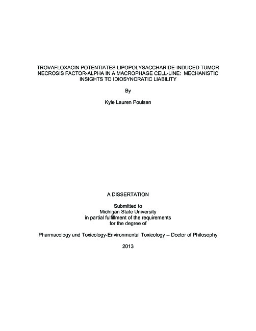 Idiosyncratic drug-induced liver injury (IDILI) is an adverse response to many pharmaceuticals representing a significant public health risk associated with significant morbidity and mortality in humans. IDILI is responsible for many of the FDA-imposed restrictions on drug therapies, representing additional regulatory and financial burdens. Despite the extensive efforts put forth to develop safe and effective drugs, the causes of IDILI are not well understood. Models of IDILI in animals have been developed recently in which coadministration of a nontoxic dose of an IDILI-associated drug and an otherwise nontoxic dose of bacterial lipopolysaccharide (LPS) precipitates hepatocellular injury. A key component to most of these drug-LPS hepatotoxicity models is a drug-mediated increase or prolongation of LPS-induced tumor necrosis factor-alpha (TNF) release in the plasma of animals that precedes the onset of toxicity. The focus of this dissertation was to model a drug-mediated increase in LPS-induced TNF release in vitro and study the underlying mechanisms responsible for the increased LPS-induced TNF release. Trovafloxacin (TVX), an antibiotic with IDILI liability, is hepatotoxic in mice when coadministered with LPS. TVX prolongs LPS-induced plasma TNF in mice, and this prolongation is required for hepatotoxicity. One hypothesis for the prolonged plasma is that TVX increased LPS-induced synthesis and release of TNF from inflammatory cells. Accordingly, a model of TVX/LPS coexposure was established in RAW 264.7 macrophage-like cells to recapitulate the increased LPS-induced TNF release. TVX increased LPS-induced TNF release in a concentration- and time-dependent manner. Analysis of the changes to upstream inducers of Tnf expression revealed that TVX activated mitogen activated protein kinases (MAPKs) ERK and JNK. The increased LPS-induced TNF release from RAW cells required ERK- or JNK-dependent signaling. The next group of studies tested the hypothesis that TVX increases LPS-induced TNF release due to eukaryotic topoisomerase poisoning, an off-target effect of TVX. An in silico analysis indicated that TVX could bind favorably to human topoisomerase, and TVX decreased human topoisomerase activity in a cell-free assay. In RAW cells, TVX induced a marker of DNA damage and activated ataxia telangiectasia-mutated Rad-3-related (ATR) kinase. ATR-dependent signaling was required for the TVX-mediated increase in LPS-induced TNF release. These results indicated that TVX poisoned topoisomerase in RAW cells and the resultant DNA damage led to ATR activation, which was required for the TVX-mediated increase in LPS-induced TNF release. In summary, the phenomenon of the TVX-mediated increase in LPS-induced TNF release in RAW cells in vitro recapitulated observations in vivo. The model in RAW cells was used to identify key signaling mechanisms which could increase LPS-induced plasma TNF in animals and identified a possible TVX-specific target in cells which could explain the IDILI liability associated with TVX in humans.