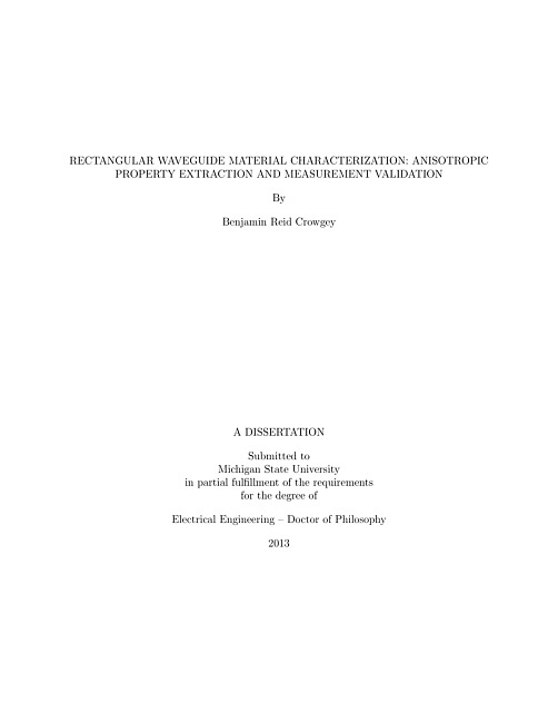 Rectangular waveguide methods are appealing for measuring isotropic and anisotropic materials because of high signal strength due to field confinement, and the ability to control the polarization of the applied electric field. As a stepping stone to developing methods for characterizing materials with fully-populated anisotropic tensor characteristics, techniques are presented in this dissertation to characterize isotropic, biaxially anisotropic, and gyromagnetic materials. Two characterization techniques are investigated for each material, and thus six different techniques are described. Additionally, a waveguide standard is introduced which may be used to validate the measurement of the permittivity and permeability of materials at microwave frequencies. The first characterization method examined is the Nicolson-Ross-Weir (NRW) technique for the extraction of isotropic parameters of a sample completely filling the cross-section of a rectangular waveguide. A second technique is proposed for the characterization of an isotropic conductor-backed sample filling the cross-section of a waveguide. If the sample is conductor-backed, and occupies the entire cross-section, a transmission measurement is not available, and thus a method must be found for providing two sufficiently different reflection measurements.The technique proposed here is to place a waveguide iris in front of the sample, exposing the sample to a spectrum of evanescent modes. By measuring the reflection coefficient with and without an iris, the necessary two data may be obtained to determine the material parameters. A mode-matching approach is used to determine the theoretical response of a sample placed behind the waveguide iris. This response is used in a root-searching algorithm to determine permittivity and permeability by comparing to measurements of the reflection coefficient.For the characterization of biaxially anisotropic materials, the first method considers an extension of the NRW technique for characterization of a sample filling the cross-section of a waveguide. Due to the rectangular nature of the waveguide, typically three different samples are manufactured from the same material in order to characterize the six complex material parameters. The second technique for measuring the electromagnetic properties of a biaxially anisotropic material sample uses a reduced-aperture waveguide sample holder designed to accommodate a cubical sample. All the tensor material parameters can then be determined by measuring the reflection and transmission coefficients of a single sample placed into several orientations. The parameters are obtained using a root-searching algorithm by comparing theoretically computed and measured reflection and transmission coefficients. The theoretical coefficients are determined using a mode matching technique. The first technique for characterizing the electromagnetic properties of gyromagnetic materials considers requires filling the cross-section of a waveguide. The material parameters are extracted from the measured reflection and transmission coefficients. Since the cross-sectional dimensions of waveguides become prohibitively large at low frequencies, and it is at these frequencies that the gyromagnetic properties are most pronounced, sufficiently large samples may not be available. Therefore, the second technique uses a reduced-aperture sample holder that does not require the sample to fill the entire cross section of the guide. The theoretical reflection and transmission coefficients for both methods are determined using a mode matching technique. A nonlinear least squares method is employed to extract the gyromagnetic material parameters. Finally, this dissertation introduces a waveguide standard that acts as a surrogate material with both electric and magnetic properties and is useful for verifying systems designed to characterize engineered materials using the NRW technique. A genetic algorithm is used to optimize the all-metallic structure to produce a surrogate with both relative permittivity and permeability near six across S-band, and with low sensitivity to changes in geometry to reduce the effects of fabrication errors.