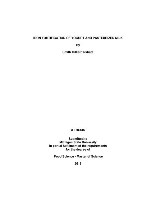 ABSTRACTIRON FORTIFICATION OF YOGURT AND PASTEURIZED MILKBySmith Gilliard NkhataBoth yogurt and pasteurized liquid milk was made from whole cow's milk which was fortified with ferrous bisglycinate, ferrous lactate and ferrous sulfate microencapsulate. Yogurt was stored for 7 days and milk for 2 days before consumer acceptance sensory test was done. Chemical analysis was done every 5 days for yogurt and every 3 days for pasteurized milk. Sensory mean scores show that there were no significant differences between the control yogurt and yogurt fortified with ferrous sulfate microencapsulate in appearance, flavor, mouthfeel and overall preference. Significant differences (p<0.05) were observed between control yogurt and yogurt fortified with ferrous bisglycinate and yogurt fortified with ferrous lactate. The observation was different in milk where no significant differences were observed in appearance and flavor in all treatments while control milk and milk fortified with ferrous lactate showed no significant differences in taste. Both thiobarbituric acid (TBA) and peroxide value (PV) numbers were highest in yogurt and pasteurized milk fortified with ferrous sulfate microencapsulate. Control yogurt had the lowest TBA value. PV was lowest in yogurt fortified with ferrous lactate while pasteurized milk has low PV in control. Therefore ferrous sulfate microencapsulate was the best option for fortifying both yogurt and pasteurized liquid milk.