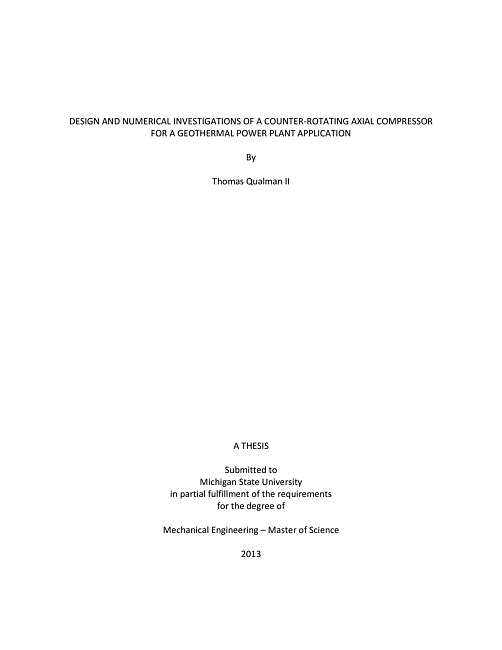 Geothermal provides a steady source of energy unlike other renewable sources, however, there are non-condensable gases (NCG's) that need to be removed before the steam enters the turbine/generator or the efficiency suffers. By utilizing a multistage counter-rotating axial compressor with integrated composite wound impellers the process of removing NCG's could be significantly improved. The novel composite impeller design provides a high level of corrosion resistance, a good strength to weight ratio, reduced size, and reduced manufacturing and maintenance costs. This thesis focuses on the design of the first 3 stages of a multistage counter-rotating axial compressor with integrated composite wound impellers for NCG removal. Because of the novel technique, an unusual set of constraints required a simplified 1 and 2D design methodology to be developed and investigated through CFD. The results indicate that by utilizing constant thickness blades with constant shroud radius (to ease manufacturing difficulties) a total pressure ratio of 1.37 with a total polytropic efficiency of 89.81% could be achieved.
