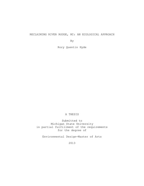 In this research based design thesis, the relationshipbetween human and non-human ecosystems was explored through thecreation of a hypothetical master plan design for the city ofRiver Rouge, MI, USA, to remedy the current problems facedthere, specifically the loss of urban density, indigenous habitat destruction, and wasteful stormwater management techniques.The design is presented through a series of plan view schematics, and images from a three-dimensional model. A Post-treatmenttest was conducted to evaluate the attractiveness via a visualquality analysis comparing current site photographs to createdscenes. Scores were compared using an un-paired T-Test. Resultsshow a significant improvement of visual quality when comparingmean values and also the 95% confidence intervals. Means differby -28.18 ± 5.392 (a lower/more attractive Visual Qualityscore). The 95% confidence interval found that the original sitemean scores falls between 61.18 and 81.21, while the createdmean lies within 37.15 and 48.89. The P value for this experiment was found to be less than 0.0001. Treatments utilized within this study prove promising to improve this suffering suburbof Metropolitan Detroit, MI.