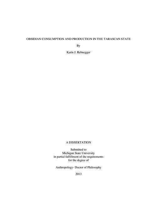 "This research seeks to understand the nature and change in the use of obsidian before and after the rise of the Tarascan Empire. I explore the obsidian sources used and the items made from that obsidian. The analysis includes artifacts from three sites within the Lake Pat́zcuaro Basin, Michoacań, Mexico: Tzintzuntzan, Erongarícuaro, and Urichu ... " -- Abstract.