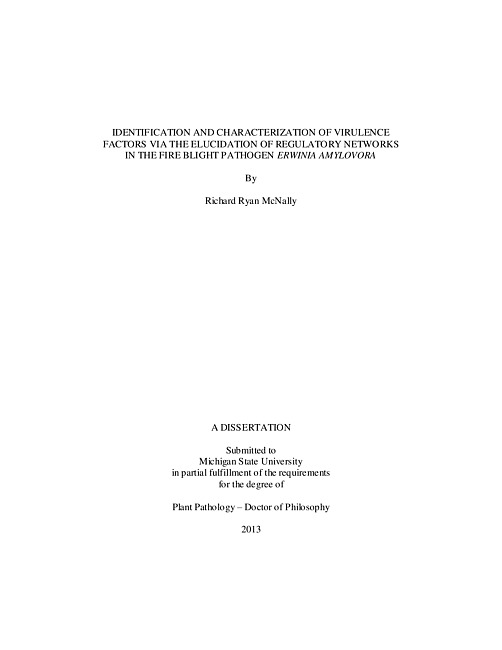 Erwinia amylovora is a Gram-negative bacterium and the causal agent of fire blight, a destructive disease of rosaceous species such as apple and pear. The genetic determinants of fire blight disease development include a diverse array of virulence mechanisms including biofilm formation and the type III secretion system (T3SS). The activity of these virulence factors in E. amylovora is coordinated by a complex system of regulatory elements that interact with all stages of gene expression and function. As such, the characterization of virulence regulators is a powerful tool for understanding host-microbe interactions via the identification of downstream virulence mechanisms. In E. amylovora, multiple virulence regulators control disease development including the alternative sigma factor HrpL. HrpL is conserved in many bacterial plant pathogens and plays a vital role the transcription of both structural and translocated components of the T3SS. While the role of HrpL in regulating the T3SS is indispensible for pathogenesis, the HrpL regulon also includes a large number of uncharacterized genes that do not have predicted roles in type III secretion. Because the HrpL regulon is a quintessential virulence regulon, uncharacterized genes regulated by HrpL are likely to play important roles in disease development. Using a combined approach including microarray expression analyses, bioinformatics, and mutagenesis, six novel virulence factors were identified including a biofilm regulator NlpI (EAM_3066), a transcriptional regulator YdcN (EAM_1248) and a HrpL-regulated gene cluster including EAM_2938. -- Abstract.