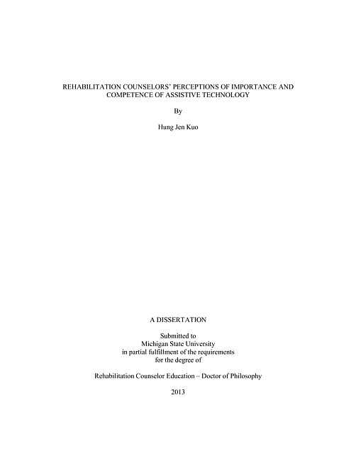 Assistive technology (AT) has been identified as one of the most effective interventions for rehabilitation purposes of individuals with disabilities. Due to the positive potentials, assistive technology has attracted tremendous attention among the rehabilitation counselors during the past decades. As a result, numerous AT devices have been created and research has been conducted attempting to improve quality of lives of individuals with disabilities. While many successful rehabilitation stories were revealed by AT assisted individuals, the implementation of AT does not always equal to successes. In fact, the high AT abandon rate has been a critical issue for the rehabilitation counselors. One of the identified reasons for the high AT abandon rate is the mismatch between the person and the device. In order to increase successful rate and decrease the possibility of mismatch, training specifically designed for building rehabilitation counselors' AT skills is needed. However, despite the recognition of AT training needs, very few master level rehabilitation counseling programs offer stand-alone AT classes to their students. Reasons for the missing of designated AT training include the lack of time, financial resource and manpower among these programs. Therefore, in order to design the AT training with the constraints these programs have, it is crucial to learn what the most important AT knowledge and skills are for the rehabilitation counselors. As a response to the current issue, this study focused on exploring current certified rehabilitation counselors' (CRC) perception of importance and competence in relation to their AT knowledge and skills. A sample of 242 CRCs was randomly drawn from the database of Commission on Rehabilitation Counselor Certification (CRCC). An Internet-based instrument was utilized as means for data collection. The quantitative design of this study yielded several statistical analyses. Results showed that AT was consistently considered one of the most important skills that rehabilitation counselors should have. However, although AT was considered to be important, rehabilitation counselors in general did not perceive competent to provide such services. The finding was alarming and demonstrated that more AT trainings were needed. In addition, for both perceived importance and perceived competence scales, significant differences were found between AT skill areas (understanding AT, using AT, and making AT decision), which provided insights of what AT skills should be prioritized when designing curriculum. Specific AT skills, which the participants rated important and less competent, were also identified for future training references. Data generated from this study can be used to inform current practitioners, rehabilitation counselor training programs, and future research directions. Limitations and implications were also discussed.