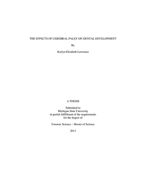 The ways in which cerebral palsy affects the growth and development of the human body and skeleton have been thoroughly documented in the scientific literature. Information on the effects of cerebral palsy on dental development, however, is scarce. The primary goal of this thesis is to determine the effects of cerebral palsy on dental development using a commonly practiced anthropological method of age estimation. The Moorrees, Fanning, and Hunt (1963a,b) method of age estimation is used in this study to estimate the ages of a sample of 51 children with a diagnosis of cerebral palsy from the University of Michigan Health System Hospital Dentistry Clinic. The sample is comprised of panoramic dental radiographs and periapical radiographs from 37 males and 14 females between the ages of 3 and 15. After the estimated ages were determined, they were compared with the known chronological ages using paired and independent t-tests to determine if a significant difference existed between the two. The results showed that the Moorrees et al. method of age estimation under-aged 75% of the sample of children with cerebral palsy by an average of 1.25 years. It was concluded that the dental development of the sample of children with cerebral palsy was delayed relative to the unaffected sample used in the Moorrees et al. study. As a result, it was also concluded that the Moorreess et al. method of age estimation is not recommended for use on individuals with cerebral palsy