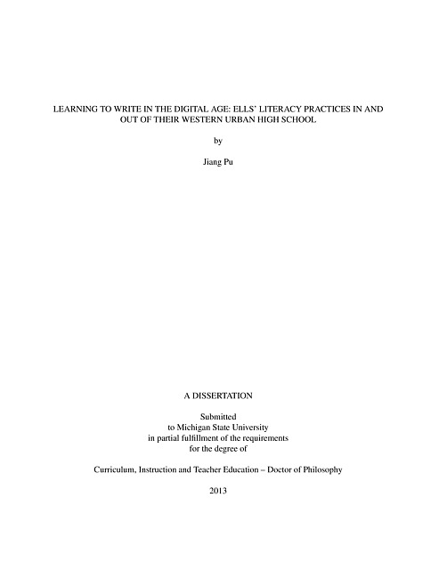 ABSTRACTLEARNING TO WRITE IN THE DIGITAL AGE: ELLS' LITERACY PRACTICES IN ANDOUT OF THEIR WESTERN URBAN HIGH SCHOOLbyJiang PuThe definition of literacy is constantly changing and expanding. A sociocultural view ofLiteracy considers literacy to be multiple, multimodal, and multilingual as situated in and acrossthe social and cultural contexts. As technology, new media and social network has reformedmany aspects of writing, they provide ELLs (English language learners) with supports andresources while at the same time raising new challenges. Although adolescent ELLs are avery active group that use technology, new media and social network, they remain an under-represented group in the L2 writing research; and very little is known about the the socialpractices of these writers as they use technology and digital media to develop and maintainsocial relationships in the local and global contexts. It is important to examine their writingpractices across the school, home, and community contexts as they are immersed in technologyand digital literacy practices.In the light of a sociocultural and socio-critical view of literacy, I conduct the year-longethnographically oriented multiple case studies of 4 high school students in a Western ur-ban community in the United States in order to understand their school-sponsored and self-sponsored writing practices in the digital age; and to examine the relationship, potential linkand possible gaps between these practices. I observe their in-class writings in a 6-week period,and throughout the year collect multiple sources of data from formal and informal interviews,survey, field notes, literacy log, writing samples, and their self-select writing artifacts. I also be-come a member of their web-based social networks and gain access to their writings on the weblogs, forums, Facebook, and Twitter. In the inductive analysis of the data, I notice importantand recurrent themes such as the writers' identity construction and negotiation, socialization,and language use.Findings reveal that while school-sponsored writings provide opportunities for both indi-vidual and collaborative writings and chances of sharing, students consider certain tasks moremeaningful than others. As the four participants in this study engaged in a wide range of self-sponsored out-of-school literacy practices, every participant was unique in their choice of thetypes of literacy practices, their preferences for the medium of composing, the sharing of theirwritings, and the language choices for their writings. One important findings is that their choicesof languages, code meshing, and frequent use of internet and urban slangs showed their eager-ness to belong to an adolescent social circle which valued their ethnicity, gender, linguisticheritage, and popular cultural literacies. As they consider English "extremely important", theyall value their heritage languages as part of their identity construction. The links between theschool and self-sponsored writings are obvious. There is overlapping in topics, genres, recurrentthemes, language uses, sociocultural experiences that feed the writings. The writing processesare also impacted by each other. As for the gaps, while self-sponsored writings provide morechances for sharing and expressing, they are more informal and sometimes even fragmentary. Iargue that while it is important to acknowledge the richness of students' self-sponsored writingsand the potentials of technology and social networks, educators should not over-romanticizethese writings or the role of technology, as they may also become distractions. It is also impor-tant to focus on the meaningful connections and possible gaps rather than drawing a boundarybetween the in-school and out-of-school literacy.This study offers new understandings and insights into the writing practices of the Englishlanguage learners in the digital age. It calls for future longitudinal studies that connect thesecondary and post-secondary education which will provide more complete descriptions anduseful information on how they could be better prepared for college writing classes.