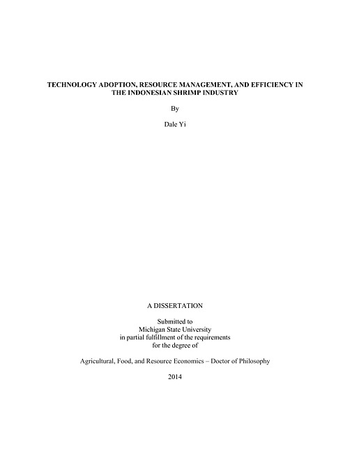 As the second largest producer in the world, shrimp aquaculture plays an important role in the Indonesian economy, particularly in the economies of rural coastal communities. Aggregate production statistics demonstrate that shrimp aquaculture production is increasing rapidly, and this expansion is due largely to the intensification of production practices via the use of a new shrimp HYV (high-yield variety). However very little is known regarding (1) which farmers are constrained in adopting the HYV and the complementary feed technology; (2) the effect HYV diffusion on mangrove forests, and; (3) the efficiency of agricultural traders in the dynamic shrimp industry. These gaps in knowledge are addressed by the following: (1) chapter 1 examines the adoption of HYV and shrimp feed among household aquaculture farms. Results show that while there are no farm-scale barriers to adopting HYV, small farms are constrained in full intensification via the adoption of feed; (2) chapter 2 explores the impact of HYV diffusion on the rehabilitation of mangrove forests. Results show that HYV diffusion increases the probability that villages will replant mangrove forests to mitigate erosion; (3) chapter 3 examines the factors determining allocative inefficiency among trader in the shrimp value-chain. Results show that there are efficiencies of scale, and that institutional arrangements affect allocative ability.
