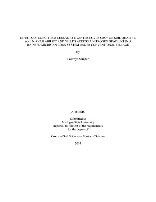 The objectives of this study were to (1) evaluate the 9-year cumulative effects of a winter rye cover crop on soil quality in a corn-corn-soy rotation, (2) measure N supply and soil N pools after cereal rye WCC incorporation and its impacts on corn N availability across an N fertilizer gradient (0, 34, 67, 101, 134, 168, or 202 kg ha-1) during the 2013 growing season, and (3) assess N response to corn yield under WCC and no cover crop (fallow) treatments from 2006 to 2013. This experiment was conducted at Michigan State University's W.K. Kellogg Biological Station using a split-split plot RCBD with a main plot effect of winter rye cover crop versus winter fallow, split into seven subplots, which were randomly assigned to a gradient of N fertilizer. Between 2006 and 2013, the annual aboveground cereal rye WCC accumulation ranged between 0.53 to 1.46 Mg ha-1. Cereal rye WCC did not affect soil structure (bulk density, water stable aggregates), soil-water relationships (total porosity, soil water retention), or soil biological activity (POXC, soil enzyme activity, litterbag decomposition rates). Our most interesting finding was the effect of WCC on enhanced POM-C content of the large POM fraction (p=0.05), but no other measure of soil organic matter pools. Our results find evidence of synchrony of N mineralization to crop N demand after cereal rye WCC compared to fallow plots during the 2013 corn growing season. Over the 9-yr period of this study, WCC posed no negative impacts on corn yields compared to fallow treatment plots.