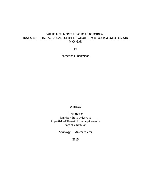 ABSTRACTWHERE IS "FUN ON THE FARM" TO BE FOUND? :HOW STRUCTURAL FACTORS AFFECT THE LOCATION OF AGRITOURISM ENTERPRISES IN MICHIGANByKatherine E. Dentzman With growing emphasis on diversifying the agricultural sector, there is increasing interest in developing agritourism especially for small to mid-sized producers. This paper contributes to the literature in this subfield of scholarship by moving beyond the motivations of producers and consumers to consider what structural factors of place might explain the presence of agritourism operations. Using data on agritourism enterprises from the Michigan Agri-Tourism Association, I test three contending hypotheses. The first, derived from the literature on agritourism, argues that urban-ness is the main structural factor determining the presence of agritourism businesses. My second hypothesis, derived from Bourdieu's cultural capital theory, predicts that spatially grouped capitals such as income and education will be the main predictors of agritourism location. This goes beyond pure numbers of people and instead investigates the characteristics these groups possess that may create spaces supportive of agritourism. Finally, I hypothesize that urban-ness and capitals work together to predict the presence of agritourism more effectively than either factor alone. The results show that while spatial capitals are a stronger predictor of the location of agritourism enterprises, urban-ness has a unique multiplier effect that helps counties increase their number of agritourism businesses to three or more. This helps to resolve some debate over the complex effect of urban-ness on agritourism. The implications for future research and policy are discussed.