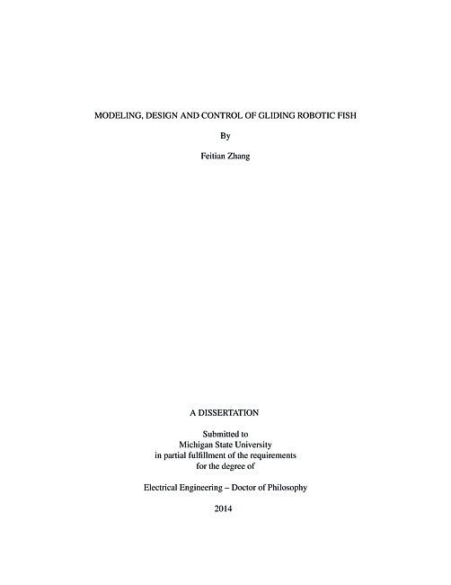Autonomous underwater robots have been studied by researchers for the past half century. In particular, for the past two decades, due to the increasing demand for environmental sustainability, significant attention has been paid to aquatic environmental monitoring using autonomous underwater robots. In this dissertation, a new type of underwater robots, gliding robotic fish, is proposed for mobile sensing in versatile aquatic environments. Such a robot combines buoyancy-driven gliding and fin-actuated swimming, inspired by underwater gliders and robotic fish, to realize both energy-efficient locomotion and high maneuverability. Two prototypes, a preliminary miniature underwater glider and a fully functioning gliding robotic fish, are presented. The actuation system and the sensing system are introduced. Dynamic model of a gliding robotic fish is derived by integrating the dynamics of miniature underwater glider and the influence of an actively-controlled tail. Hydrodynamic model is established where hydrodynamic forces and moments are dependent on the angle of attack and the sideslip angle. Using the technique of computational fluid dynamics (CFD) water-tunnel simulation is carried out for evaluating the hydrodynamic coefficients. Scaling analysis is provided to shed light on the dimension design. Two operational modes of gliding robotic fish, steady gliding in the sagittal plane and tail-enabled spiraling in the three-dimensional space, are discussed. Steady-state equations for both motions are derived and solved numerically. In particular, for spiral motion, recursive Newton's method is adopted and the region of convergence for this method is numerically examined. The local asymptotic stability of the computed equilibria is established through checking the Jacobian matrix, and the basins of attraction are further numerically explored. Simulation and experiments are conducted to validate steady-state models and calculated equilibria for both motions.Tail-enabled feedback control strategies are studied in both sagittal-plane glide stabilization and three-dimensional heading maintenance. A passivity-based controller and a sliding mode controller are designed and tested in experiments for those two problems, respectively. In sagittal-plane glide stabilization, a nonlinear observer is designed and implemented to estimate velocity-related states. A three-dimensional curve tracking problem is also discussed and a two-degree-of-freedom control scheme is proposed by integrating static inverse mapping and H&infin control technique. The differential geometric features, such as the torsion and curvature, are explored for planning the trajectory.Finally, the field tests with the lab-developed prototype of gliding robotic fish are conducted in the Kalamazoo River, Michigan and the Wintergreen Lake, Michigan for detecting oil spill and sampling harmful algal blooms, respectively. Both gliding and spiraling motions are tested in the experiments as well as the fish-like swimming. The field test results are presented to show the effectiveness of the designed robot in environmental monitoring tasks.