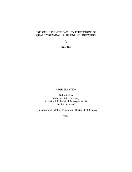 ABSTRACTEXPLORING CHINESE FACULTY PERCEPTIONS OFQUALITY STANDARDS FOR ONLINE EDUCATIONByXiao DaiOnline education has become a major component of higher education. With the rapid growth of online learning, stakeholders are concerned that higher education institutions might have increased access but lowered quality. Facing scrutiny and accountability demands, online education programs are often called to demonstrate quality. The challenge facing online education is how to widen access and reduce costs, while at the same time improving and ensuring quality.In order to ensure quality, many organizations in the United States have developed standards and guidelines that detail the essential criteria for online programs to plan, evaluate, and improve quality. However, defining and implementing quality standards are complex issues. There are questions about the completeness of these quality standards. There are also unknowns of how much these quality standards, as developed by U.S. organizations, can be applied in educational settings other than the U.S.This study explored how U.S. quality indicators for online education are perceived by Chinese faculty. Nine sources from the U.S. literature were identified to represent U.S. online education quality standards. Thirty-one quality indicators were assembled, and a survey was administered to 400 Chinese online faculty and their teaching assistants at a Chinese institution. The results indicate that U.S. quality indicators for online education are perceived by Chinese faculty as relevant, with high ratings on the perceived importance of these indicators. Most respondents feel that this set of quality indicators reflects their criteria of quality; and that China should adopt them. The study also reveals, from the open-ended questions responses, that U.S. quality standards are not fully capturing the essence of quality for online education. Quality indicators, as reflected in the U.S. quality standards, focus more on the elements and conditions that are considered as inputs, but not enough on the outcomes. This suggests that even if the Chinese institutions replicate these indicators, the quality assurance process is not necessarily going to address the concerns that come out of the open-ended questions responses.Because of the shortcomings and the incompleteness of these U.S. quality indicators, Chinese higher education institutions should be cautious in borrowing them. In order to successfully apply these U.S. indicators in China, Chinese scholars and institutions should expand and modify these U.S. quality indicators to suit the Chinese educational environment. This dissertation further discusses what expansion and modifications are needed, and how China may go about such modification. The dissertation concludes with the study's implications for quality assurance practices in China and for future studies of the quality of online education.