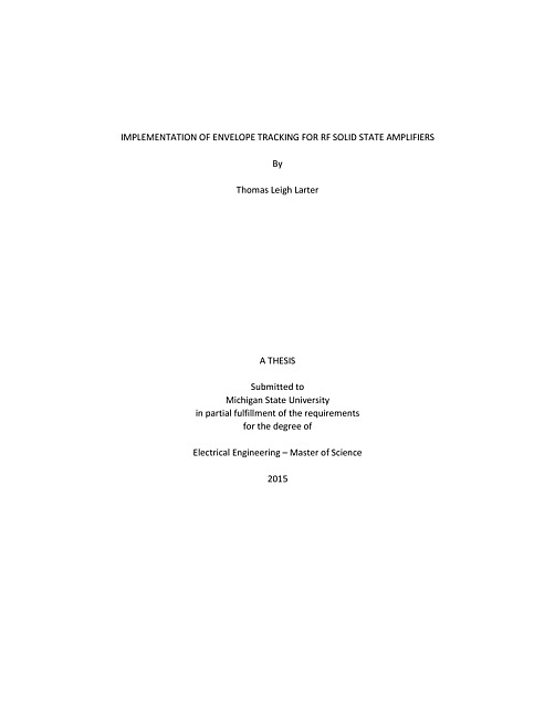 ABSTRACTIMPLEMENTATION OF ENVELOPE TRACKING FOR RF SOLID STATE AMPLIFIERSBy Thomas Larter The Facility for Rare Isotope Beams (FRIB) is currently in its development stages at Michigan State University. The facility uses a large linear accelerator system to accelerate ionized particles which are then collided with other particles in the hopes of finding rare isotopes of elements. This accelerating action depends on several systems to function, with one of the major systems being superconducting cavity structures. These cavities are driven by high-power RF amplifiers which account for a large portion of the accelerator's power consumption. It is important to maximize the efficiency of these amplifiers in order to keep energy costs for the facility low. One of the ways to increase efficiency is to choose an amplifier topology that is highly efficient. A study was done for FRIB testing the prospect of using amplifiers with the envelope tracking (ET) topology. An amplifier's efficiency relies on its output power and the power supplied to it, which are in turn directly related to the output signal voltage and supply rail voltage. In an ET RF amplifier, the supply voltage is made to closely follow the envelope of the output signal voltage. This tracking action allows the RF amplifier to operate with much improved efficiency at low power levels and nearly constant efficiency at high power levels. The ET tests performed for FRIB attempted to verify the validity of ET efficiency gains for RF amplifiers. These tests included the characterization of an RF amplifier, development and verification of an ET control algorithm, and implementation of an ET test bench using FRIB equipment. These tests should attest to the purported increase in efficiency possible with ET and prove that the power consumption budget for the FRIB will benefit from the use of such amplifiers.