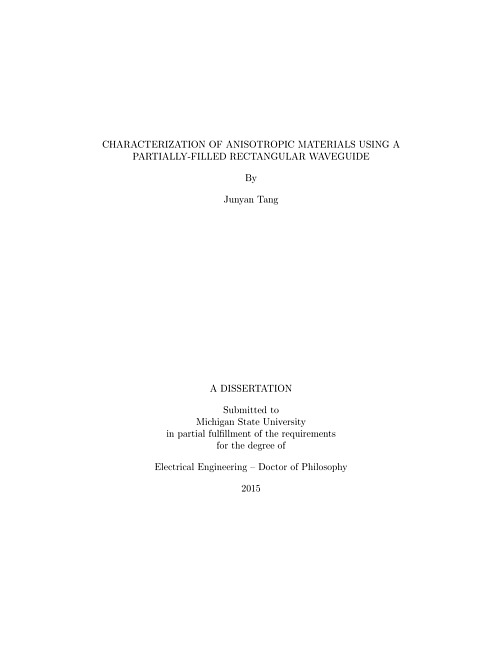 Engineered materials with special electromagnetic properties are gaining an interest for applications where tailored material parameters are needed to meet stringent requirements. As the number of applications and the complexity of the engineered materials increase, there is a growing need for characterization methods that can accurately predict the constitutive parameters of these materials. Rectangular waveguide methods are popular in characterizing isotropic and anisotropic materials for many reasons, such as ease of sample preparation, high signal strength due to field confinement, the ability to control the polarization of the applied electric field, and high transmission efficiency over a broad frequency band. However, most characterization techniques based on rectangular waveguides are implemented by placing the sample against various metallic objects such as irises or posts, or by confining samples in sample holders, which increases the measurement complexity and the extraction uncertainties. In this work, a partially-filled waveguide technique that overcomes the drawbacks of the traditional methods is investigated for the characterization two types of anisotropic materials: biaxial and gyromagnetic. The first group of materials considered for this characterization method are biaxial materials, which have three nonzero entries in each material tensor, corresponding to six complex material parameters that must be extracted. Typically three different samples are manufactured from the same material and placed into the rectangular waveguide in three orientations in order to interrogate the material along three orthogonal axes. Instead of using three samples, this technique uses a single cubical sample of biaxial material which is placed at the center of a guide and measured under three different rotations, providing the required number of reflection and transmission measurements to determine the six unique constitutive parameters. The theoretical reflection and transmission coefficients are determined using a modal analysis. The desired complex constitutive parameters can be obtained by minimizing the difference between theoretical and measured data.The second type of materials considered in this work are gyromagnetic. Gyromagnetic materials have scalar permittivity and anisotropic permeability which can be described by a tensor with three diagonal entries and two off-diagonal entries. Since the cross-sectional dimensions of waveguides become large at low frequencies where the gyromagnetic properties are most pronounced, and sufficiently large samples that can fill the cross-section of the waveguide are typically unavailable, a technique overcomes the limitation of sample size and only requires the sample to fill part of the guide is beneficial. The measured refection and transmission coefficients can be obtained from a gyromagnetic sample under various experimental configurations. The theoretical refection and transmission coefficients are determined using a mode matching technique. A nonlinear least squares method is employed to extract the gyromagnetic material parameters using optimization algorithms in Matlab.