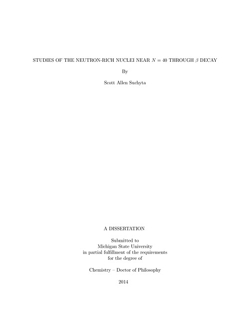 Nuclear structure evolves as a progression is made from stable to exotic nuclei. The energy spacings between the single-particle orbitals that protons and neutrons occupy are not constant and change based on the ratio of protons to neutrons in a nucleus. The promotion of nucleons across an energy gap into a higher shell can drive nuclei from spherical to deformedshapes. When a deformed state arising from the filling of a higher orbital has a similar energy to a spherical state in which there is no occupation of the higher orbital, the situation is known as shape coexistence. Due to nuclear-structure evolution, in radioactive nuclei, the energy of an intruder orbital that originates from a higher shell near stability can become close to the energy of a lower-shell orbital. Therefore, the filling of intruder orbitals is often associated with nuclear deformation and low-energy shape coexistence. Demonstrating the evolution of nuclear structure, rapid changes have been observed in the properties of neutron-rich nuclei with neutron numbers near 40. A subshell closure has been proposed at N = 40 in 6828Ni40 based on the energy gap between the upper fp shell and the 0g9/2 orbital. However, collectivity rapidly develops in the 6626Fe40 and 6424Cr40 isotopes. Ground-state deformation, largely interpreted in terms of the occupation of the intruder ν0g9/2 orbital, has accordingly been inferred for 66Fe and 64Cr. Two separate experiments were performed at the National Superconducting Cyclotron Laboratory that provided insight about the excitation of neutrons out of the fp shell in theneutron-rich nuclei with approximately 40 neutrons and 28 or fewer protons. The nuclei studied were populated primarily through β decay. Isomeric decays of metastable excited states were also observed. In each experiment, the radioactive ion beam was deposited into a semiconductor detector that was used to detect both the implantation of the ions and their subsequent β decays. The β-decay detector was surrounded by an ancillary array of high-purity Ge detectors for gamma-ray detection. The results of both experiments complement prior work and emphasize the important role of the ν0g9/2 orbital in the low-energy levelschemes of the neutron-rich nuclei near N = 40. One experiment investigated the decay of the first excited state in 68Ni populated through the β decay of 68Co, and the analysis of decay events relied heavily on pulse-shape analysis. The ν0g9/2 orbital has an impact on the low-energy level scheme of 68Ni, and the first excited state is due to the excitation of a pair of neutrons across the N = 40 gap. The energy of the first excited state in 68Ni was measured precisely and determined to be significantly lower than the value reported previously. The decay strength of the excited state was also determined precisely. Interpreting within a simple two-level mixing model, the experimental results are consistent with Monte Carlo shell-model calculations that predict shape coexistence between a spherical 68Ni ground state and an oblate first excited state. A second experiment involved the study of the β decay of 61,63V to the odd-A 61,63Cr37,39 isotopes, where data were previously scarce. The inferred level scheme of 61Cr has anincreased low-energy level density relative to the neighboring lower mass odd-A Cr isotopes. The change in the level scheme of 61Cr was attributed to the onset of deformation resulting from the excitation of neutrons out of the fp shell. The isomeric decays of metastable states in 64,6625Mn39,41 were also investigated. Based on the inferred low-energy level schemes, shape coexistence was proposed, with the ground states of 64,66Mn having deformed shapes butthe isomeric states being spherical.