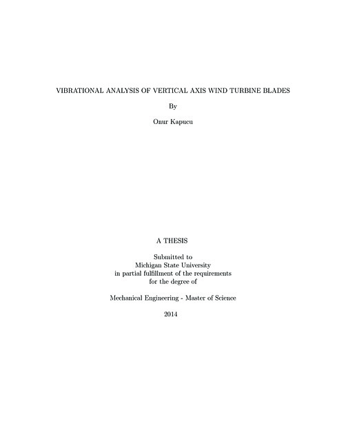 The goal of this research is to derive a vibration model for a vertical axis wind turbineblade. This model accommodates the aects of varying relative ow angle caused by rotatingthe blade in the ow eld, uses a simple aerodynamic model that assumes constant windspeed and constant rotation rate, and neglects the disturbance of wind due to upstream bladeor post. The blade is modeled as elastic Euler-Bernoulli beam under transverse bendingand twist deections. Kinetic and potential energy equations for a rotating blade underdeections are obtained, expressed in terms of assumed modal coordinates and then pluggedinto Lagrangian equations where the non-conservative forces are the lift and drag forces andmoments. An aeroelastic model for lift and drag forces, approximated with third degreepolynomials, on the blade are obtained assuming an airfoil under variable angle of attackand airow magnitudes. A simplied quasi-static airfoil theory is used, in which the lift anddrag coecients are not dependent on the history of the changing angle of attack. Linearterms on the resulting equations of motion will be used to conduct a numerical analysis andsimulation, where numeric specications are modied from the Sandia-17m Darrieus windturbine by Sandia Laboratories.