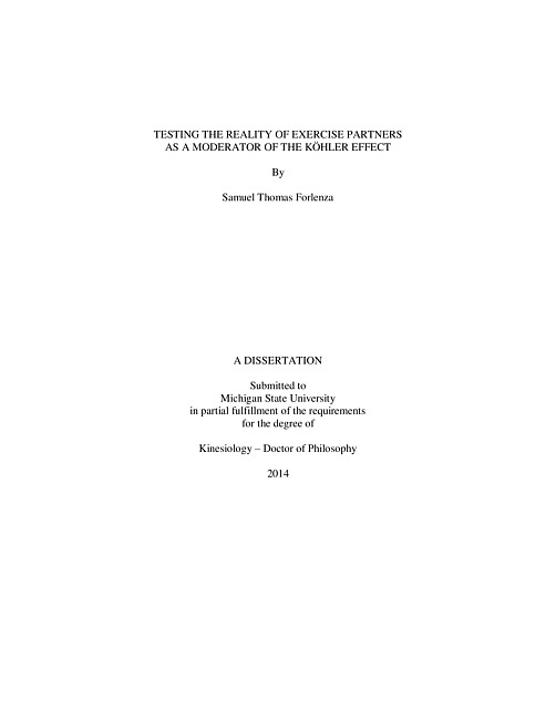 Few people engage in recommended amounts of physical activity, and as such, it is important methods are sought out that could help people improve their motivation to sustain exercise. One potential way to do this is to leverage the power of group dynamics, specifically, the Köhler effect (Stroebe, Diehl, & Abakoumkin, 1996). When two people of moderately unequal abilities are partnered together on a conjunctive task, the weaker group member tends to perform better, and this performance gain is known as the Köhler effect (Kerr & Hertel, 2011).A growing body of research supports the idea that the Köhler effect can be combined with exergames to produce improvements in the length of time people hold plank exercises (e.g., Feltz, Kerr, & Irwin, 2011). However, the research thus far has only made use of pre-recorded confederates purported to be live human partners. While this approach has been successful, it may not be practical on a large scale. Therefore, the purpose of this dissertation is to explore whether or not the Köhler effect can be achieved with different types of partners.One approach is to use a computer-generated partner. Some research shows that people will team up with computers, suggesting that there is the potential for these types of interactions to improve motivation and performance (Nass, Fogg, & Moon, 1996). Another potential partner is an imagined partner. Research has shown that using associative imagery (imagery focused on the task) and dissociative imagery (imagery focused on something unrelated to the task) helps extend performance on muscular endurance tasks, suggesting that combining imagery and the Köhler effect could be an effective match (Razon et al., 2010).To test this, participants (220 undergraduate students) were randomly assigned to one of six experimental conditions (virtually-real partner, altered virtually-real partner, software-generated partner, imagined partner, associative imagery, dissociative imagery) or to a no-partner, no-imagery control condition. Participants performed two blocks of plank exercises, holding each exercise for as long as possible. The first block was a baseline measure, performed individually and without imagery. For the experimental conditions, the second block was performed either with a partner or with the use of imagery. Measures of exercise duration, perceived exertion, self-efficacy beliefs, enjoyment, intention to exercise the following day, and impressions of one's partner and group were collected.Results from the main analysis indicated that participants in the experimental groups generally held plank exercises for longer during the second block compared to the control participants, supporting the idea that computer-generated partners, imagined partners, and imagery can be used to increase the time people hold plank exercises. Ancillary analyses indicated that participants in the partner conditions perceived themselves as working harder during the second block, while participants in the imagery and control conditions did not. There were no differences in self-efficacy beliefs, enjoyment, and intention to exercise the following day.These findings are consistent with past research (Feltz et al., 2011) and suggest that incorporating computer-generated partners into exergames may boost how long people play these games. The use of imagined partners and imagery may also be effective methods to improve performance during traditional exercise. As a muscular endurance task was used, future researchers could use a similar paradigm to test these results with aerobic exercise, which would have a greater potential to positively influence health.