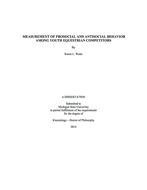 ABSTRACTMEASUREMENT OF PROSOCIAL AND ANTISOCIAL BEHAVIOR AMONG YOUTH EQUESTRIAN COMPETITORSByKaren L. WaiteAccording to the American Horse Council (2005), there are approximately 9.2 million horses in the United States. Contrary to popular belief, more horses are shown (i.e., compared to one another in various classes of conformation or skill) than raced. While the number and scope of studies of competitive equestrian activity is limited, the general areas of concern in equestrian sport parallel those in more traditional sports. Based on a survey conducted at a Michigan State University Extension workshop on horse show ethics, the top five ethical concerns pertaining to horse shows were matters of sportsmanship, horse welfare issues, violations of rules and regulations, concerns about fair judging, and parenting issues (Skelly, Heleski, Tomlinson, Zanella, & Waite, 2005). There is a disconnect, however, between the often held belief that participation in competitive equine activity teaches sportsmanship and the fact that the equine industry is calling for improvements in sportsmanship behavior and animal treatment at horse shows. Therefore, the research objectives of this dissertation were to (a) quantify the incidence of aggressive riding behaviors of youth horse show participants, (b) quantify the conflict, stress, and frustration behaviors of the horses they ride, and (c) determine the relationship between aggressive riding and horse behavior. The objectives of the second study were to (a) develop a preliminary scale for measuring prosocial and antisocial behavior in equestrian sport and (b) to verify the psychometric properties of such a scale. The first study examined the frequency with which aggressive riding was used in a youth cloverleaf barrel race, and questioned the belief that the use of aggressive riding techniques, considered by some to be poor sportsmanship, would result in a horse running faster, thus improving final run time. These data suggest that across all horse and rider teams studied, there was wide variation in the employment of aggressive riding tactics, but there was no relationship between aggressive riding technique and final run time. There were small but significant relationships between the use of aggressive riding technique and conflict/stress/irritation behaviors displayed by the horse, however. The second study focused on developing a preliminary scale to define and measure sportsmanship in competitive youth equestrian events. The research protocol in this study used an approach developed by Kavussanu and Boardley (2009), while keeping with the views of Vallerand, Deshaies, Cuerrier, Brière, and Pelletier (1996), who suggested that "athletes should be in a prime position to identify the nature of the sportsmanship concept" (p. 91). The development of the Prosocial and Antisocial Behavior in Equestrian Sport (PABES) scale described in this dissertation went further in that it also included the perspectives of horse judges and show managers, parents of equestrian competitors, and coaches, trainers, and 4-H leaders. This process resulted in a noteworthy start in the development of the scale; however, further work is needed to develop items to appropriately measure the construct of "respect for the horse." In addition, any modified scale should be retested with a sample of youth participating at introductory or 4-H levels, which may improve the fit of the model overall. Given the broad scope of age, competitive experience level, and differences in discipline, future tools to measure sportsmanship in equestrian sport may start with a common, respect-based definition, but will need to focus on specific aspects of a specific discipline or audience to develop a valid instrument.