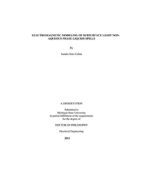 ABSTRACTELECTROMAGNETIC MODELING OF SUBSURFACE LIGHT NON-AQUEOUS PHASE-LIQUIDS SPILLSBySandra Soto-CabánHydrocarbon contamination from fuel leaks and spills has been one of the most common ground water pollution problems in the United States for decades. Generally, underground leaks and spills are difficult to detect and locate and can cause serious health problems to people living close to the contaminated areas. The goal of this study is to simulate a contaminated region and determine its physical limits within a tolerable level of certainty given the characteristics of the soil in question without the environmental and financial cost of physical experimentation. The first part of this study is focused in the determination of the dielectric properties of soil and contaminated soil. A coaxial fixture was designed to characterize dry and contaminated soil samples in the frequency range of 100 MHz to 1 GHz. Experimental results for contaminated and uncontaminated soil samples are presented and analyzed. Values of permittivity obtained using the designed coaxial waveguide were used to calculate the scattering electric fields of a simulated contaminated underground system. The information collected from these simulations was used in the reconstruction of the contrast profile of two lossless configurations involving dielectric circular cylinders buried in soil. The image-reconstruction algorithm is based on the Fourier diffraction theorem and multiple frequencies were used to improve resolution.The problem was simulated using a two-dimensional formulation since three-dimensional structures need not be considered in the context of the underground mapping application. This study is not intended to achieve buried material identification of contaminants. However, a wide, full volume scanning of a potentially contaminated area is useful for ecological impact mitigation since it can be coupled with borehole assays to determine the specific contaminant and extent of contamination. With such information, environmental engineers can determine the need and the most suitable method for mitigation. Hence, the proposed radio frequency based survey research is meant to provide a screening tool to be used in concert with other methods.
