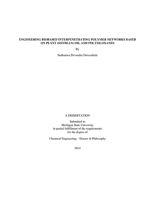 Interpenetrating Polymer Networks (IPNs) are materials containing two or more components that have been polymerized and crosslinked in the presence of each other to form entangled (interpenetrated) networks. The morphology of such crosslinked entanglements of two, or more, diverse immiscible polymeric networks can lead to interesting physical properties due to development of single-phase morphology at the macro scale. Currently, products derived from IPNs find applications ranging from to ion-exchange resins, adhesives, high impact plastics, thermoplastics, vibration-damping materials (for outdoor, aircraft and machinery applications), high temperature alloys and medical devices. Siloxane polymer systems in IPNs with rigid materials such as polyacrylates or polystyrene provide high flexibility, water vapor permeability and biocompatibility. This thesis reports on studies, of newly engineered biobased IPN systems based on soybean oil and polysiloxanes. Soybean oil is a triglyceride molecule containing on average 4.6 double bonds per mole. Reaction with vinyltrimethoxy silane through "ene" chemistry provides silylated soybean oil. Silylation of oligomerized soybean oil provides a more viscous, higher molecular weight polymer system for IPN formation. The second component in these IPNs was either a silanol terminated polydimethylsiloxane (PDMS) or carbinol containing hydrophilic polysiloxanes. High molecular weight PDMS was prepared by emulsion polymerization of silanol terminated silicone oligomers. Carbinol containing hydrophilic polysiloxanes were prepared by polymerization of 3-aminopropylmethyldiethoxysilane followed by a reaction with cyclic carbonate. These hydrophilic polysiloxanes were water-soluble independent of the water pH or their molecular weight and were characterized by high degree of hydrogen bonding. A series of IPNs were prepared containing different concentrations of silylated soybean oil and silicone polymers. Different processing options were studied in the production of the IPNs. These include IPNs prepared by the latex method and IPNs prepared by a solution method. In both cases evaporation of the water or the solvent led to stable siloxane crosslinks. Another process involved IPNs prepared by dissolving the water soluble polysiloxanes in the water phase that was used to emulsify the silylated soybean oil. In these IPNs, evaporation of the water phase led to crosslinked films containing stable siloxane (Si-O-Si) linkages as well as hydrolytically less stable siloxy (Si-O-C) linkages.Control of the siloxanes crosslinks provides control of morphology and prevents gross phase separation of the soybean and silicone phase. A model, based on Donatelli's equation was constructed to determine the crosslink density of these networks which was then correlated with the physical properties of these IPNs. Various processes and compositions were studied to assess the potential use of these IPNs in coating applications. The morphology of cast films from each of these IPNs revealed an intimate mixing of the two immiscible components with no apparent gross phase separation. The crosslink density, mechanical properties, thermal properties and surface properties of all IPNs were investigated and correlated with their composition. These IPNs can be utilized as high release liners, low friction materials or as general protective coatings. The combination of natural product with polysiloxanes makes these IPNs suitable for various applications in cosmetics and personal care. IPNs containing hydrolytically susceptible siloxy crosslinks can be utilized to prepare environmentally degradable materials that can be used in various control release applications.