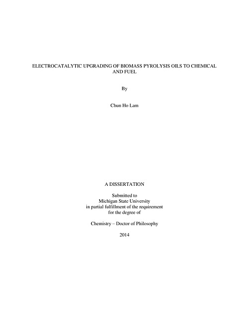 The present project's aim is to liquefy biomass through fast pyrolysis and then upgrade the resulting "bio-oil" to renewable fuels and chemicals by intensifying its energy content using electricity. This choice reflects three points: (a) Liquid hydrocarbons are and will long be the most practical fuels and chemical feedstocks because of their energy density (both mass and volume basis), their stability and relative ease of handling, and the well-established infrastructure for their processing, distribution and use; (b) In the U.S., the total carbon content of annually harvestable, non-food biomass is significantly less than that in a year's petroleum usage, so retention of plant-captured carbon is a priority; and (c) Modern technologies for conversion of sunlight into usable energy forms--specifically, electrical power--are already an order of magnitude more efficient than plants are at storing solar energy in chemical form. Biomass fast pyrolysis (BFP) generates flammable gases, char, and "bio-oil", a viscous, corrosive, and highly oxygenated liquid consisting of large amounts of acetic acid and water together with hundreds of other organic compounds. With essentially the same energy density as biomass and a tendency to polymerize, this material cannot practically be stored or transported long distances. It must be upgraded by dehydration, deoxygenation, and hydrogenation to make it both chemically and energetically compatible with modern vehicles and fuels. Thus, this project seeks to develop low cost, general, scalable, robust electrocatalytic methods for reduction of bio-oil into fuels and chemicals.