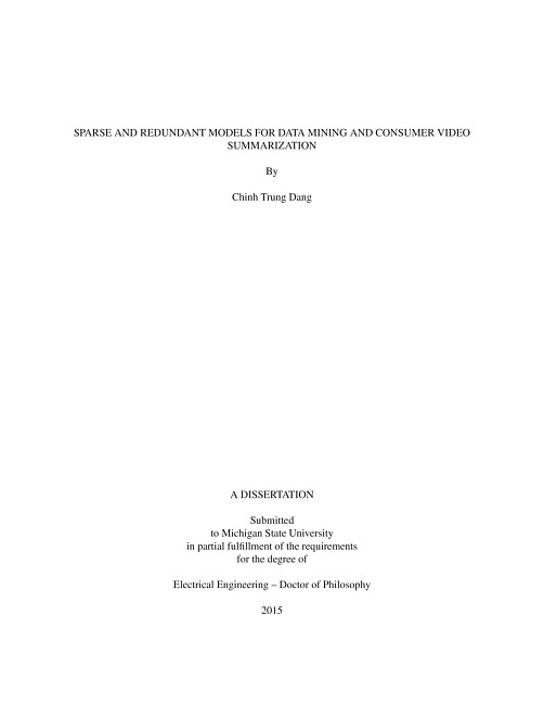 This dissertation develops new data mining and representative selection techniques for consumervideo data using sparse and redundant models. Extracting key frames1 and key excerptsfrom video has important roles in many applications, such as to facilitate browsing a large videocollection, to support automatic video retrieval, video search, video compression, etc. In addition,a set of key frames or video summarization in general helps users to quickly access importantsections (in semantic meaning) in a video sequence, and hence enable rapid viewing.The current literature on video summarization has focused mainly on certain types of videosthat conform to well-defined structures and characteristics that facilitates key frame extraction.Some of these typical types of videos include sports, news, TV drama, movie dialog, documentaryvideos, and medical video. The prior techniques on well-defined structured/professional videoscannot be applied into consumer (or personal generated) videos acquired from digital cameras.Meanwhile, consumer video is increasing rapidly due to the popularity of handheld consumerdevices, on-line social networks and multimedia sharing websites.Consumer video has no particular structure or well-defined theme. The mixed sound trackcoming from multiple sound sources, along with severe noise make it difficult to identify semanticallymeaningful audio segments for key frames. In addition, consumer videos typically have onelong shot with low quality visuals due to various factors such as camera shake and poor lightingalong with no fixed features (subtitles, text captions) that could be exploited for further information to evaluate the importance of frames or segments. For many of these reasons, consumer-videosummarization is still a very challenging problem area.In this dissertation, we present new frameworks based on sparse and redundant models of imageand video dataset toward solving the consumer video summarization problem. In particular, in thisdissertation, we investigate three different models of image and video data for summarization.1. Sparse representation of video framesWe exploit the self-expressiveness property to create `1 norm sparse graph, which is applicablefor huge high dimensional dataset. A spectral clustering algorithm has been appliedinto the sparse graph for the selection of a set of clusters. Our work analyzes each cluster asone point in a Grassmann manifold and then selects an optimal set of clusters. The final representativeis evaluated using a graph centrality technique for the sub-graph correspondingwith each selected cluster.2. Sparse and low rank model for video framesA novel key frame extraction framework based on Robust Principal Component Analysis isproposed to automatically select a set of maximally informative frames from an input video.The framework is developed from a novel perspective of low rank and sparse components,in which the low rank component of a video frame reveals the relationship of that frameto the whole video sequence, and the sparse component indicates the distinct informationof particular frames. A set of key frames are identified by solving an `1 norm based nonconvexoptimization problem where the solution minimizes the reconstruction errors of thewhole dataset for a given set of selected key frames and maximizes the sum of distinctinformation. Moreover, the algorithm provides a mechanism for adapting new observations,and consequently, updating new set of key frames.3. Sparse/redundant representation for a single video frameWe propose a new patch-based image/video analysis approach. Using the new model, wecreate a new feature that we refer to as the heterogeneity image patch (HIP) index of an imageor a video frame. The HIP index, which is evaluated using patch-based image/video analysis,provides a measure for the level of heterogeneity (and hence the amount of redundancy) thatexists among patches of an image/video frame. We apply the proposed HIP frameworkto solve both of the video summarization problem areas: key frame extraction and videoskimming.