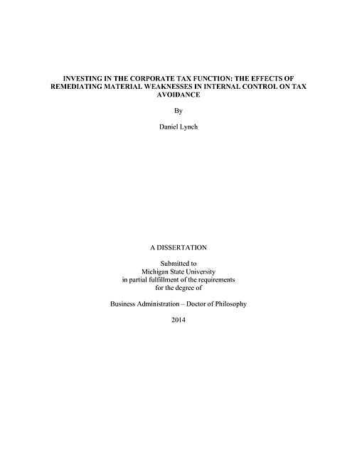 This study investigates the effect of increases in firm-level investments in the corporate tax function to address financial reporting concerns on the magnitude and timing of firm's tax avoidance. I exploit the novel setting of the remediation of tax-related material weaknesses in internal control (MWs) as a shock that motivates firms to increase investments in the corporate tax function. I examine the impact of increases in these investments on the magnitude and timing of future payoffs in the form of increased tax avoidance. I find no evidence of increases in tax function investments contemporaneously impacting tax avoidance. However, I do find that investments in the income tax function are associated with greater levels of future tax avoidance. Specifically, I find firms making investments in year t have 4-8 percentage point lower 3-year cash and GAAP effective tax rates (ETR) measured at time t +1 to t +3 compared to their industry peers. Descriptive results suggest the primary drivers of this increase in future tax avoidance are lower foreign and state tax expense. I also hand-collect internal control disclosures to investigate how firms remediate tax-related MWs. The results suggest the most common types of investments are in outside consulting and new personnel, including hiring a new tax director. I find that both external and internal tax function investments are positively associated with future tax avoidance, with no differential impact on future ETRs. Results also indicate that risk, complexity, and a lack of resources are predictors of engaging an external service provider. These results demonstrate the magnitude and timing lag of payoffs on tax function investments and illustrate how strengthening internal controls can improve firm performance via increased tax avoidance. -- Abstract.