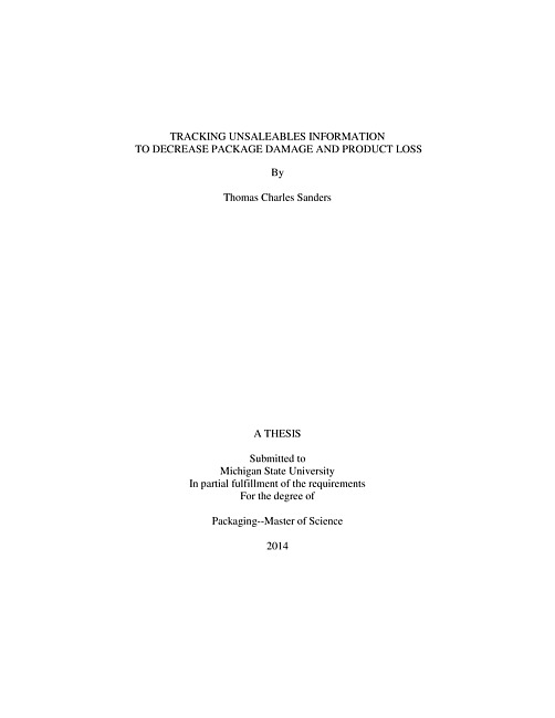 ABSTRACTTRACKING UNSALEABLES INFORMATION TO DECREASE PACKAGE DAMAGE AND PRODUCT LOSSByThomas Charles SandersThe literature review summarizes some of the joint grocery industry reports on unsaleables, discusses technologies that are being used to track distribution data, define and describe reverse logistics, and discuss types of grocery damage. This research explores seven case studies. Two independent and three large retail chains are chosen to represent a range of unsaleables management strategies. Three manufacturers are chosen because they deal extensively with unsaleables. Flow diagrams are developed to show the flow of unsaleable goods and information. It is found that there is an opportunity for electronic data exchange in reverse logistics that can help in the tracking and sharing of unsaleable product information. This research recommends seven reason codes to put unsaleable products in clearly defined categories for retailers to use when gathering unsaleables data: beyond code date, recall, theft, discontinued product/promotions/product launches, seasonal, damage and other. These reason codes were chosen to put unsaleable products in clearly defined categories. It is recommended that manufacturers gather more granular information in their audits. A list of standard tests for package damage is formed to judge package performance when damage is found to be a problem. A more scientific approach to determine shelf-life and ship-life is recommended along with a longer ship-life to better facilitate first-in, first-out (FIFO) inventory management.
