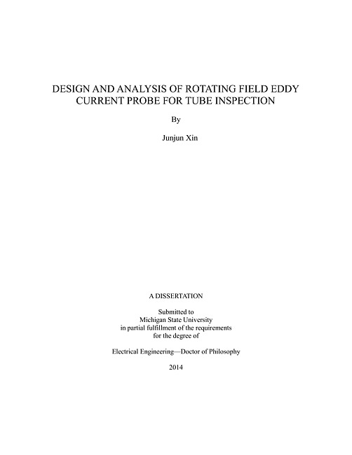 Steam generator unit in nuclear power plant comprise thousands of heat exchange tubes whereby heat from primary coolant is transferred to water circulating on the secondary side. A variety of tube degradation due to mechanical vibration and chemical interactions compromises the integrity of steam generator tubes. The rupture of these tubes may result in leakage of radioactive water to the environment. Periodic inspections aimed at timely detection and characterization of the degradation is a key element for ensuring tube integrity and safe operation of nuclear power plant. Eddy current testing has proved to be an effective technique to detect defects occurring in the tube wall. In the past two decades, three types eddy current probes developed for steam generator tube inspection include bobbin coil probe, rotating probe and array probe. Each of these probes has their own limitations.The bobbin coil probe is insensitive to circumferential cracks, and rotating probe is slow and involves complex mechanical rotation whereas the array probe has poor resolution and high cost of instrumentation. This dissertation presents the design and validation of a new rotating field eddy current probe. The probe is composed of three phase rectangular windings and pickup sensor, that can be chosen to be a simple bobbin coil or a GMR array sensor placed at the probe center. The probe avoids mechanical rotation and has fast scan speed. The rotating field probe is sensitive to all orientation defects. The axial component of magnetic field along the tubing due to a defect is measured by the pickup sensor. The probe design and performance are evaluated using an experimental validated finite element model. A reduced magnetic vector potential formulation is used for simulating the different commercial probe as well as the proposed new probe design.A probe prototype is built to validate the simulation results with respect to different defects. A parametric study is conducted using the model to optimize the design and evaluate its performance. An encircling rotating field eddy current probe utilizing similar principles is also studied in this research. A design of a rotating field probe that encircles a cylindrical sample is presented and studied. Differences in the performance in cases of magnetic and nonmagnetic tube materials are described. Initial results show the feasibility of rotating field probes to detect a variety of defect geometries.