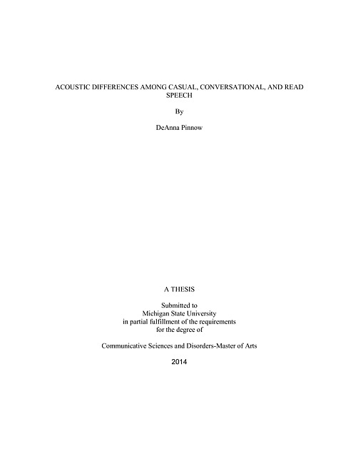 The aim of the current study was to investigate acoustic differences among laboratory read, laboratory conversational, and casual speech through well-defined speech tasks in the laboratory and in talkers' natural environments.