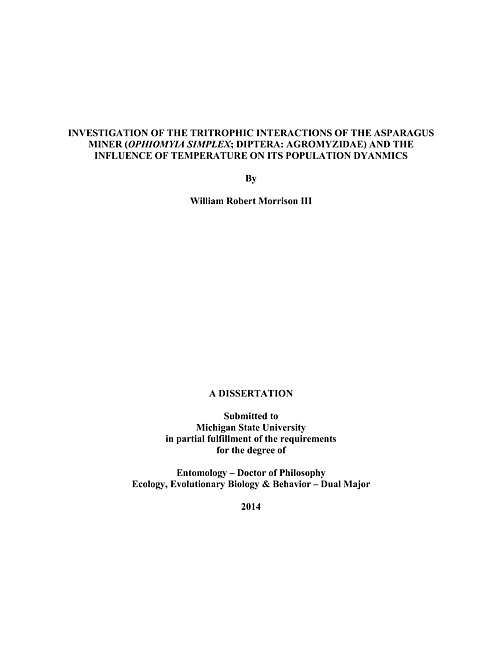 Investigation of the tritrophic interactions of the asparagus miner (Ophiomyia simplex ; diptera : agromyzidae) and the influence of temperature on its population dyanmics