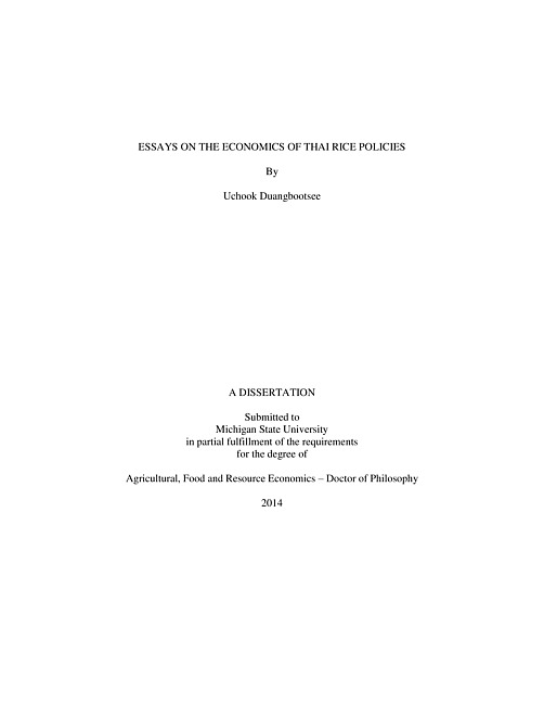 Recent debate among Thai policymakers has focused on trade-offs between two rice policies, the price support program (PSP) and the deficiency payment program (DPP). The PSP is currently operating but has been criticized for large budgetary costs, corruption, and unequal distribution of program benefits. To inform this debate, this dissertation provides quantitative measures of the trade-offs between these programs, and the ranking of farmers' preferences towards them. In addition, the relationship between program participation, production technology choice, and levels of technical efficiency are also investigated. The first essay in this dissertation investigates welfare impacts of PSP and DPP measured in terms of changes in producer surplus, consumer surplus, and deadweight loss by applying a partial equilibrium model to calculate counterfactual market prices and quantities. The 2005/06 cropping season is used as a base for the calculations because of data availability. The results indicate that DPP is more efficient than PSP because the program results in a larger percentage increase in producer surplus and smaller deadweight loss generated for a given amount of Government spending. The increase in producer surplus and the deadweight loss are estimated to be 93-97% and less than 1%, respectively under DPP compared to 28-51% and 11-14% under PSP. Consumers, especially domestic consumers, are much worse off under PSP as their surplus shrinks considerably, while it increases under DPP. The second essay investigates the preference ranking of a representative rice farmer in Thailand towards PSP and DPP using stochastic efficiency with respect to a function (SERF). SERF ranks the farmer preferences based on the certainty equivalent (CE) values associated with the stochastic profits under each policy scenario. Profit is stochastic because of yield variability, price volatility, and the risk of delayed payments under PSP. The preference ranking by SERF indicates that a risk-averse farmer clearly prefers DPP to PSP when support and target prices are much higher than the market price. However, the farmer is largely indifferent between the two programs when the price differential is small. In addition, it is shown that the farmer is better off under PSP compared to a no intervention scenario, even if their choice is to not participate, because of increases in the market price brought by the program. The third essay investigates production technologies and levels of technical efficiency among program participants and non-participants of the PSP, as well as key determinants of farmers' decisions to participate in the program. The participation decision is included in the model to account for possible selection bias in estimating stochastic production frontiers and technical inefficiency levels. Results indicate that key factors in the participation decision include land size and the financial position of the farm. Results also show there is no strong evidence to support the presence of selectivity bias in the stochastic frontier estimates. In addition, a likelihood-ratio test indicates that participants and non-participants use the same frontier production technology. However, the analysis of technical efficiency reveals that participants are more technically efficient than non-participants. The findings therefore suggest that larger farmers participate more in the PSP and that these program participants tend to be more technically efficient farmers, although the analysis was not able to determine the direction of causality for this association.
